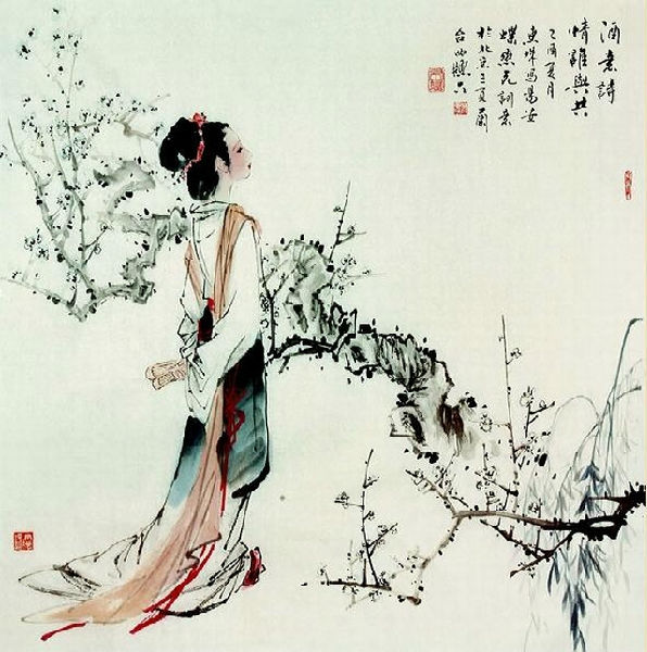 暖暖的雨,暖暖的风,送走了些许冬天的寒意。柳叶长出了,梅花怒放了,春天已经来了。端庄的少妇,也被这春意撩拨起了愁怀。爱侣不在身边,又能和谁把酒论诗呢?少妇的泪水流下脸颊,弄残了搽在她脸上的香粉。