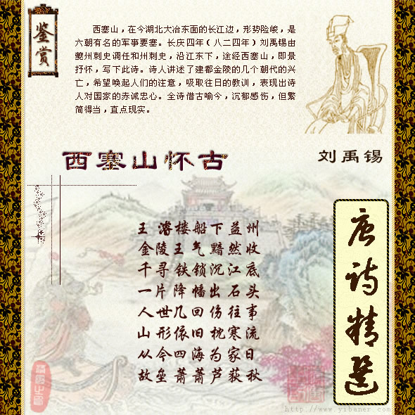 《西塞山怀古》是唐代诗人刘禹锡的作品。此诗怀古伤今。前四句,写西晋灭吴的历史故事,表现国家统一是历史之必然,阐发了事物兴废决定于人的思想;后四句 写西塞山,点出它之所以闻名,是因为曾经是军事要塞,而今山形依旧,可是人事全非,拓开了诗的主题。全诗叙说的内容是历史上的事实,状摹的景色是眼前的实 景,抒发的感叹是诗人胸中的真情。诗人巧妙地把史、景、情完美地揉合在一起,使得三者相映相衬,相长相生,营造出一种含蕴半瞻的苍凉意境,给人以沉郁顿挫 之感。
